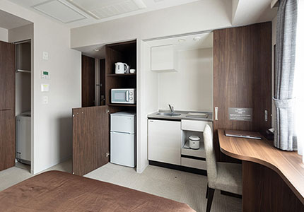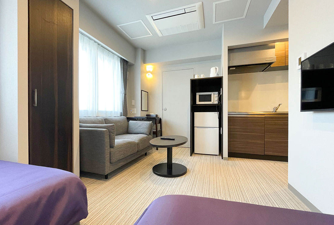 全室、家具家電完備でキッチンを備え付けてあり、ホテルでありながらマイホームと変わらずにお過ごしいただけるように生活に必要なものをすべて揃えています。短期利用にも長期滞在にもくつろぎの時間を提供いたします。